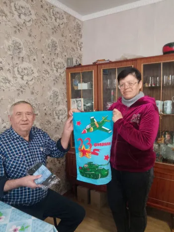 Получатели социальных услуг трепетно принимают поздравления и с блеском в глазах делятся воспоминаниями о службе.